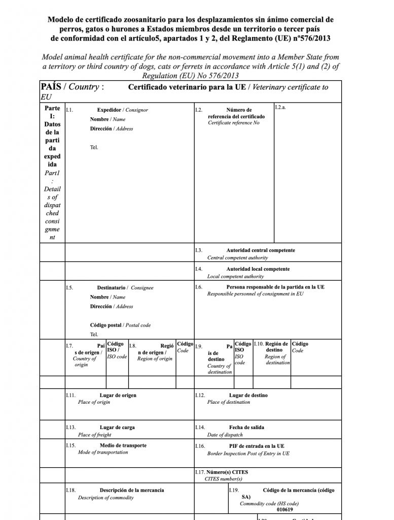 No son obligatorios para los desplazamientos desde otros Estados Miembros a España los apartados de Test serológico, Tratamiento contra las garrapatas, Tratamiento contra Equinococcus, Otras vacunaciones, Examen clínico, Legalización y Otros